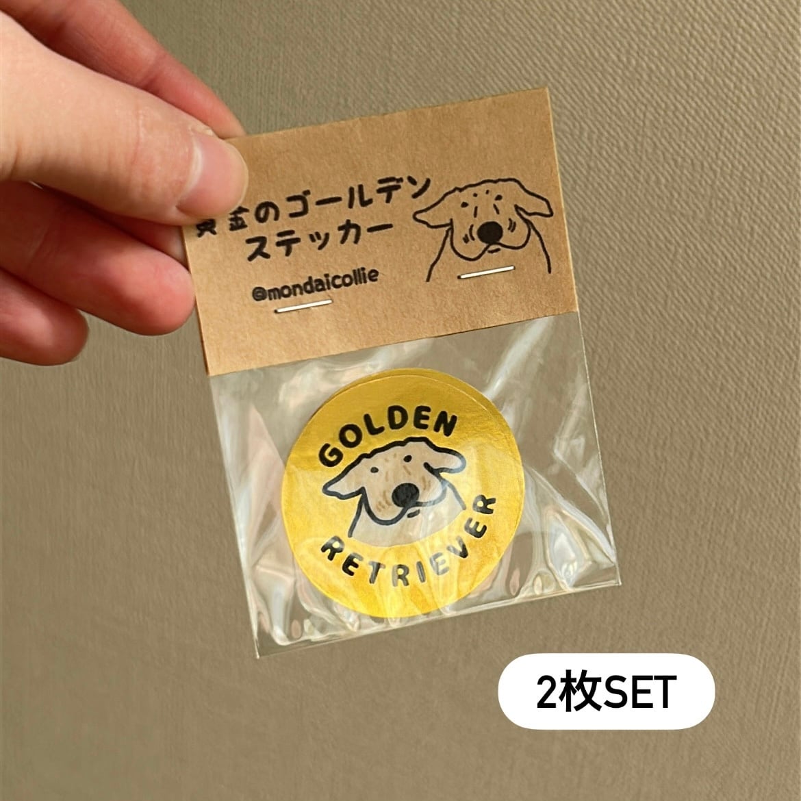 光り輝く黄金の背景からひょこっと見下ろすゴールデンレトリバー。シンプルな線で描いた思わずクスッとする表情がポイントです。