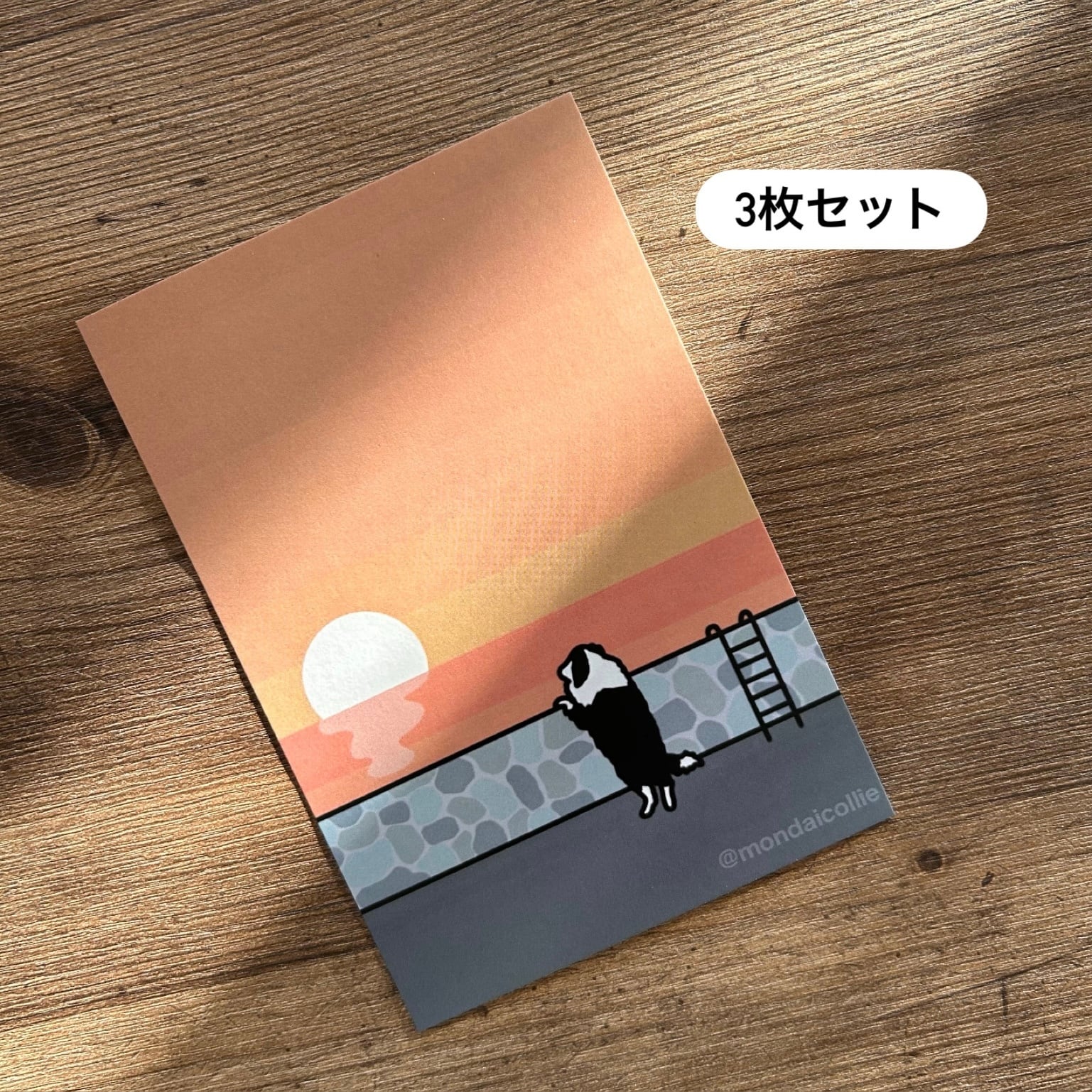 夕焼けに黄昏れるボーダーコリーのイラストポストカードです。